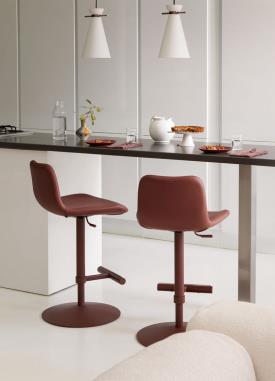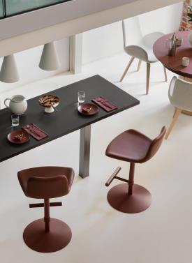 Design. Beatriz Sempere, 2017 Dimensions : l 50 x h 90/105 x p 51 cm tabouret Dalia avec base en métal pivotante et réglable en hauteur. Assise revêtue de tissu, cuir ou similicuir.